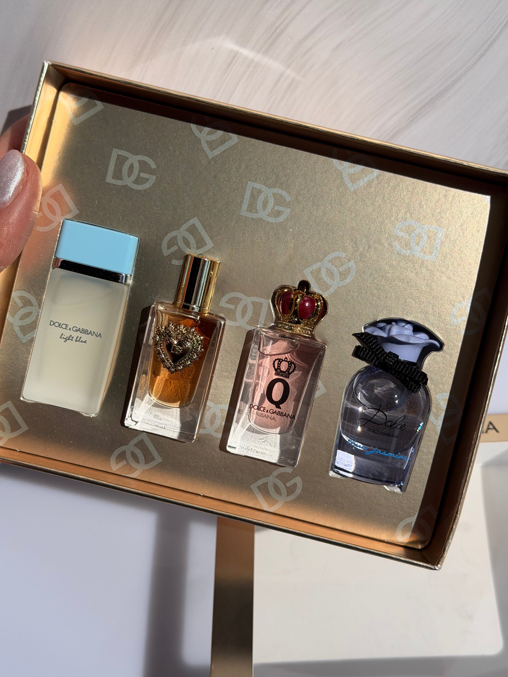 - 4 x 0,15 oz/ 5 ml de fragancias en Dolce&Gabbana Light Blue Eau de Toilette, Dolce&Gabbana Q Eau de Parfum, Dolce&Gabbana Dolce Blue Jasmine Eau de Parfum, Dolce&Gabbana Devotion Eau de Parfum